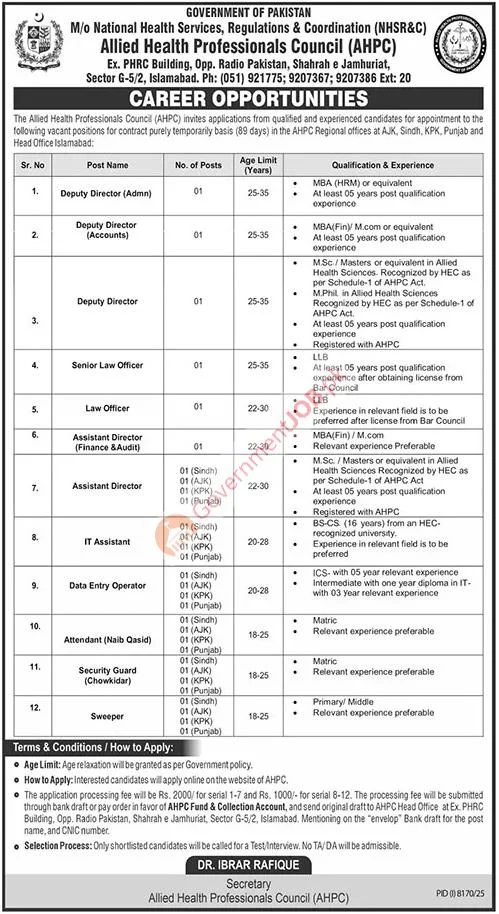 The Allied Health Professionals Council (AHPC) has unveiled its latest recruitment drive for 2026, opening doors for professionals across administrative, legal, finance, IT, allied health, and support roles. These are short-term contract positions spanning 89 days, stationed primarily at the Head Office in Islamabad and regional branches in Punjab, Sindh, Khyber Pakhtunkhwa, and Azad Jammu & Kashmir. If you’re looking for a meaningful public sector engagement under the Ministry of National Health Services, Regulations and Coordination, this is a noteworthy window to contribute to the national healthcare regulatory framework.