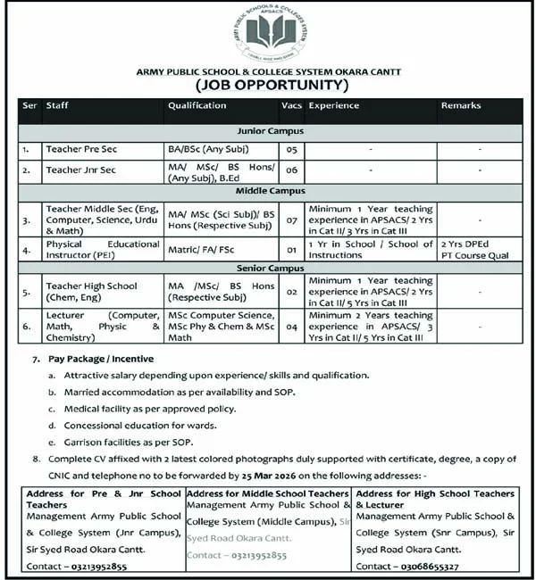Army Public School & College System (APS&C) Okara Cantt has announced a fresh round of hiring for teaching and academic staff across its Junior, Middle, and Senior campuses. This recruitment drive is part of the institution’s regular academic strengthening process aimed at maintaining quality education standards and improving student performance through qualified faculty recruitment.