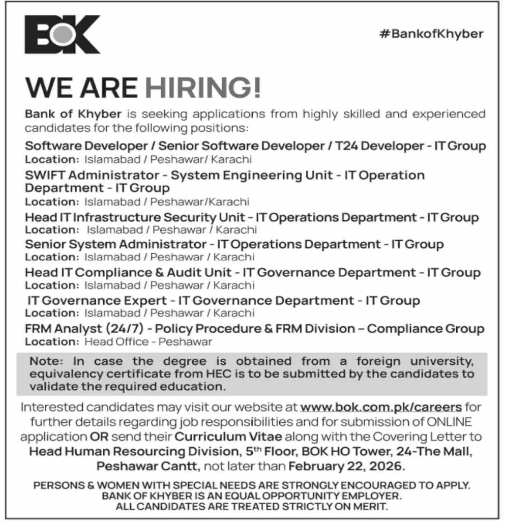 Bank of Khyber (BOK) Jobs 2026 – IT Group & Compliance Careers (Software Developers, SWIFT Admin, IT Security Heads, FRM Analyst)
