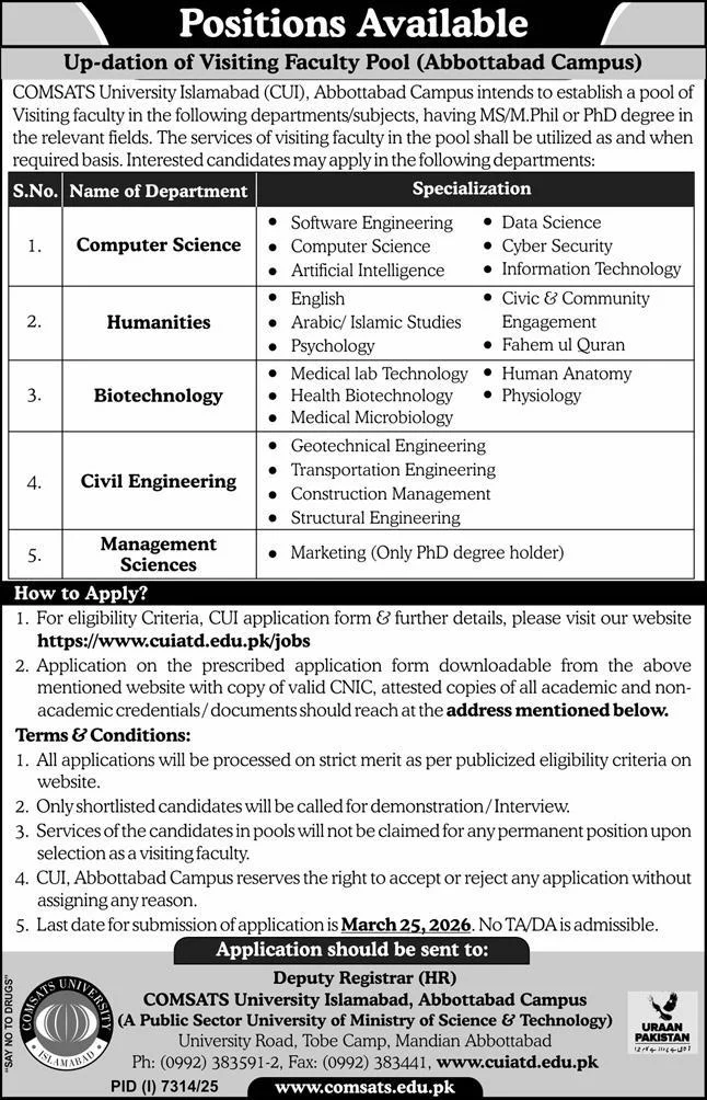 COMSATS University Islamabad Abbottabad Campus Jobs 2026 – Visiting Faculty Pool (MS/MPhil/PhD)