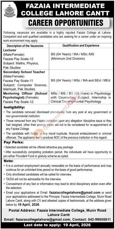 Fazaia Intermediate College Lahore Cantt is offering career opportunities for qualified individuals who want to contribute to an academic environment focused on discipline and quality education. These roles are designed for candidates who are serious about professional growth in the education sector.