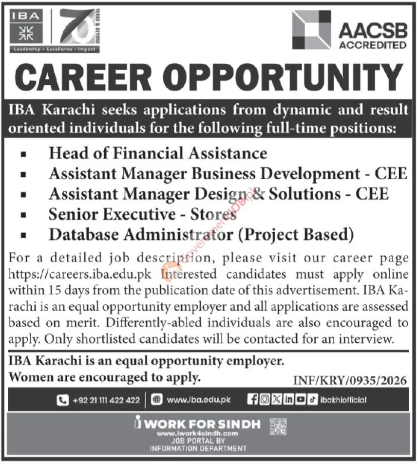 IBA Karachi Jobs 2026 for Management – Head of Financial Assistance, Assistant Manager CEE, Senior Executive Stores & Database Administrator