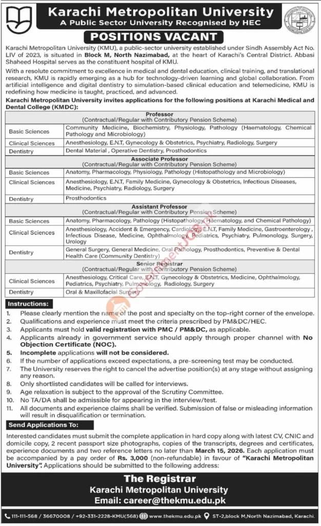 Posted: March 4, 2026 | Organization: Karachi Metropolitan University (KMU) | Location: Karachi, Sindh | Job Type: Sindh Government Public Sector University | Application Deadline: March 15, 2026 | Contact: career@thekmu.edu.pk | Note: This recruitment is conducted under the authority of the Government of Sindh and in compliance with HEC/PM&DC regulations