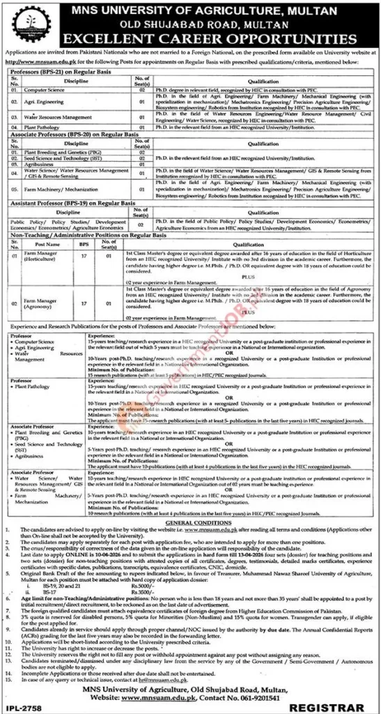 MNS University of Agriculture Multan Jobs 2026 – Professor, Associate Professor, Assistant Professor & Farm Manager (Regular Basis)