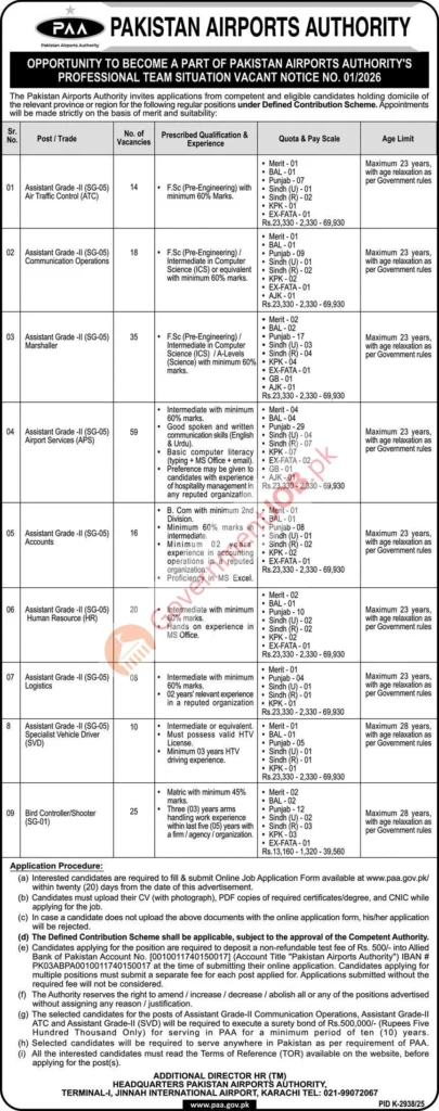 Pakistan Airports Authority (PAA) has officially announced new recruitment opportunities through Situation Vacant Notice No. 01/2026. The hiring drive aims to fill multiple operational and support roles across the aviation sector, including Assistant Grade-II positions in Air Traffic Control (ATC), Communication Operations, Marshaller services, Airport Passenger Services (APS), Accounts, Human Resources, Logistics, and Specialist Vehicle Driver roles. The authority is also recruiting Bird Controller/Shooter staff responsible for aviation safety around airport runways.