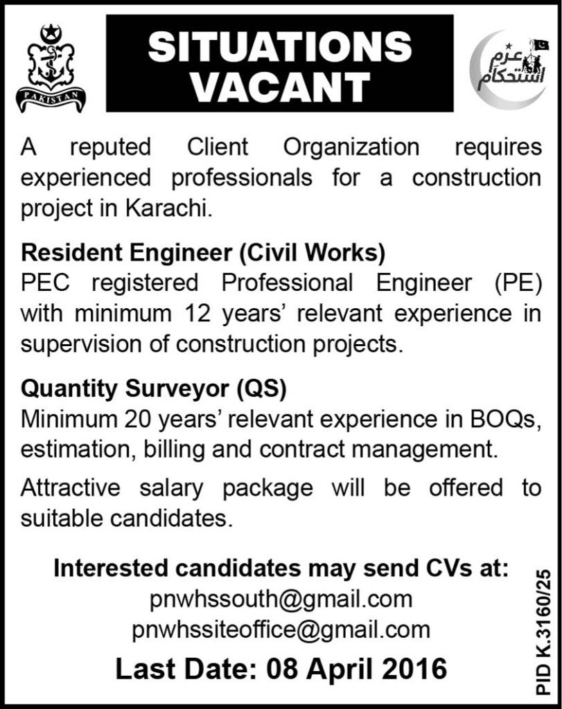 Pakistan Navy Welfare Housing Schemes has announced exciting government job opportunities for qualified professionals in the engineering department. As per the job advertisement published in the Daily Pakistan Observer on April 4, 2026, applications are invited for the positions of Resident Engineer, Resident Engineer Civil Works, and Quantity Surveyor. These are full-time, government sector posts based in Karachi, Sindh.
