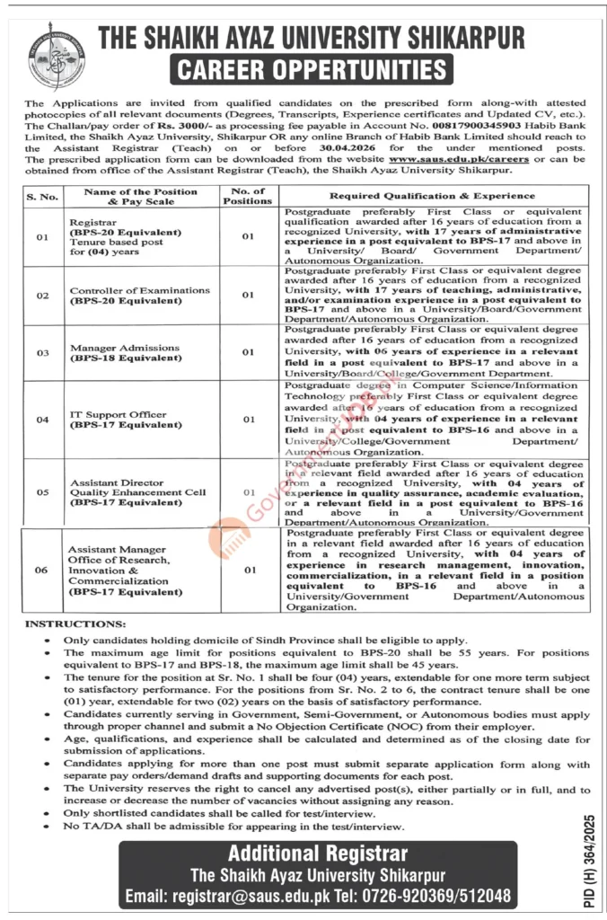 Shaikh Ayaz University Shikarpur Jobs 2026 – Apply for Registrar, Controller, Admissions, IT & Quality Enhancement Positions
